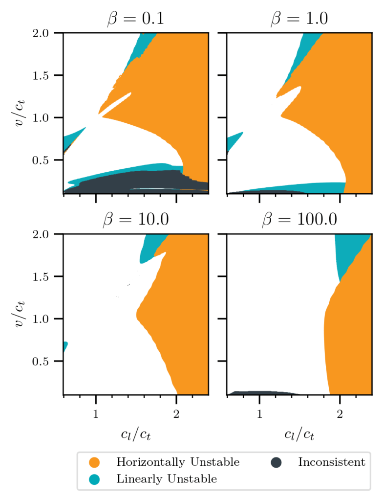 This figure shows the results of finding 160,000 analytical solutions for crack motion at the atomic scale. The horizontal axis shows the ratio of longitudinal to transverse wave speed in the material and therefore lets one scan through all possible elastic properties of isotropic linear elastic solids. The vertical axis is crack speed in units of the transverse wave speed. White regions are stable cracks. The parameter \beta determines the level of dissipation. When it is 0.1, dissipation is small as for glass. When it is 1, dissipation is moderate, as for Plexiglas. When it is 10 or 100 dissipation is large as for rubber or hydrogels. It is in these latter systems that intersonic cracks have been observed in experiment, most recently by Wang, Shi, and Fineberg.